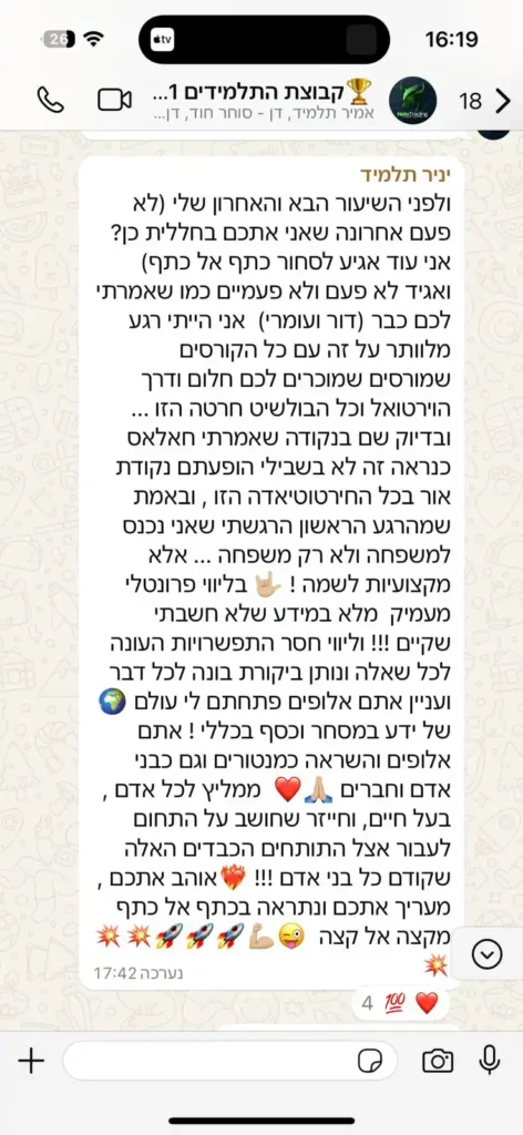 לא נשאיר אותך לבד! תמיכה מלאה, שיתוף ידע ומענה על שאלות גם לאחר סיום הקורס.