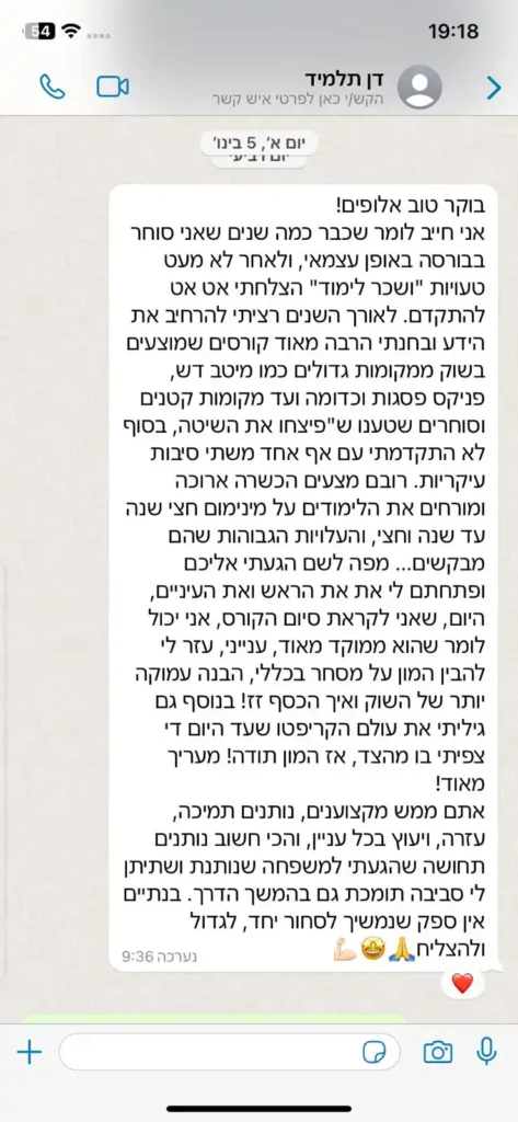 אנחנו יודעים שלסחור בצורה נכונה זה הרבה מעבר לגרפים ומספרים – זה שילוב של ידע טכני, גישה מנטלית נכונה וניהול סיכונים חכם. זו הדרך להפוך את השוק לכלי יציב שמייצר ביטחון, ולא רק למקום של ספקולציות ומזל.